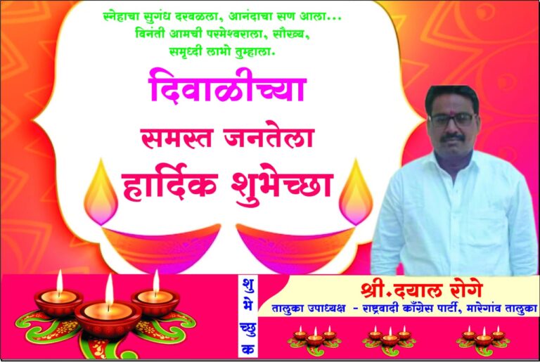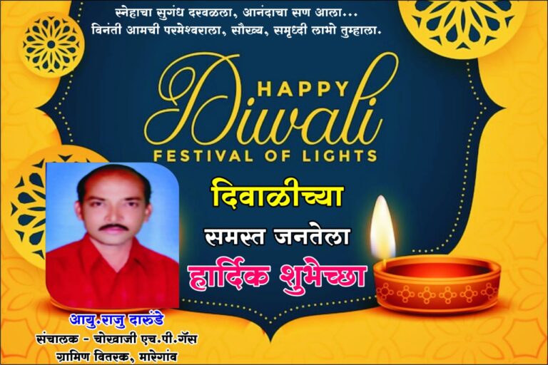 दिपावलीच्या हार्दिक शुभेच्छा ही दिपावली आपणास तसेच आपल्या परिवारास आनंदाची ,भरभराटीची , सुख समृद्धीची जावो हीच ईश्वरचरणी प्रार्थना दिपावलीच्या …